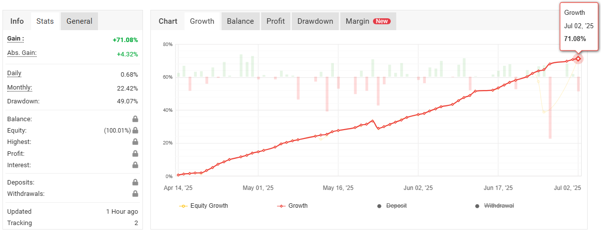 Elle offre une transparence totale sur des indicateurs clés tels que les rendements mensuels, le drawdown, la croissance du capital et bien plus encore.